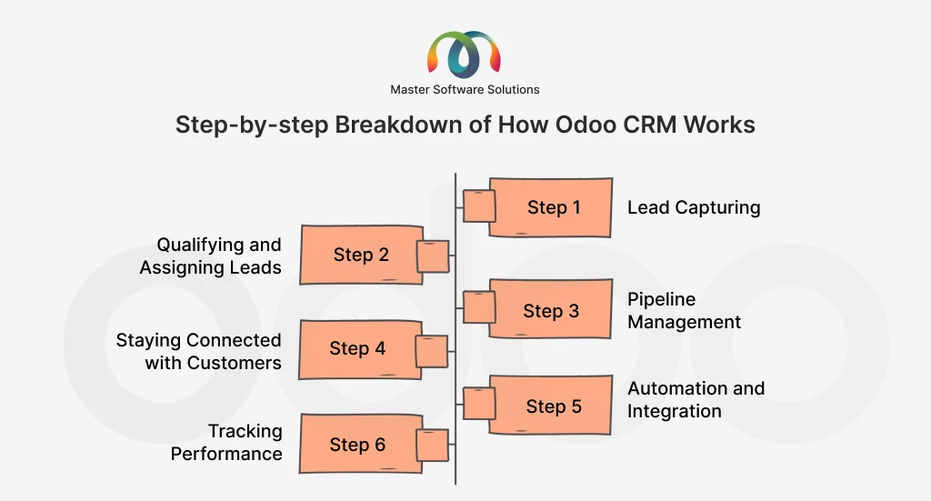 ravi garg, master software solutions, steps, working odoo crm, lead capturing, qualifying, assigning leads, pipeline management, stay connected, automation, integration, performance tracking