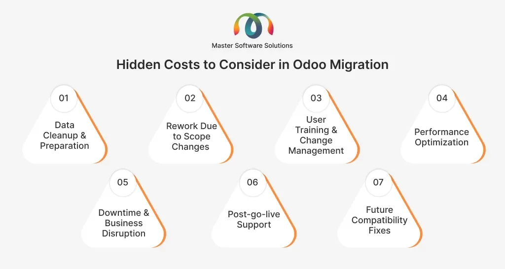 While core migration activities are usually planned and budgeted, several indirect or overlooked costs can significantly impact the total migration expense. Identifying hidden costs early helps businesses avoid budget overruns and post-go-live disruptions. When migrating to Odoo, consider the following hidden costs.