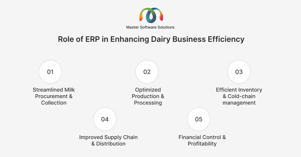 ERP software for the dairy industry plays a crucial role in improving operational efficiency across the entire dairy value chain. The system integrates procurement, production, inventory, logistics, and finance into a unified digital platform. This enables businesses to operate with greater efficiency, transparency, and control. Below is a detailed explanation of how ERP enhances efficiency in key functional areas of a dairy business.