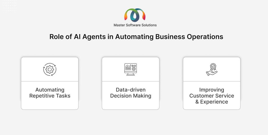 AI agents can automate various business operations, including repetitive tasks, making data-driven decisions, and enhancing customer service to improve efficiency and reduce costs. They can be integrated with business departments, including customer support, finance and accounting, sales and marketing, inventory management, and more. The roles of AI agents in business operations are: