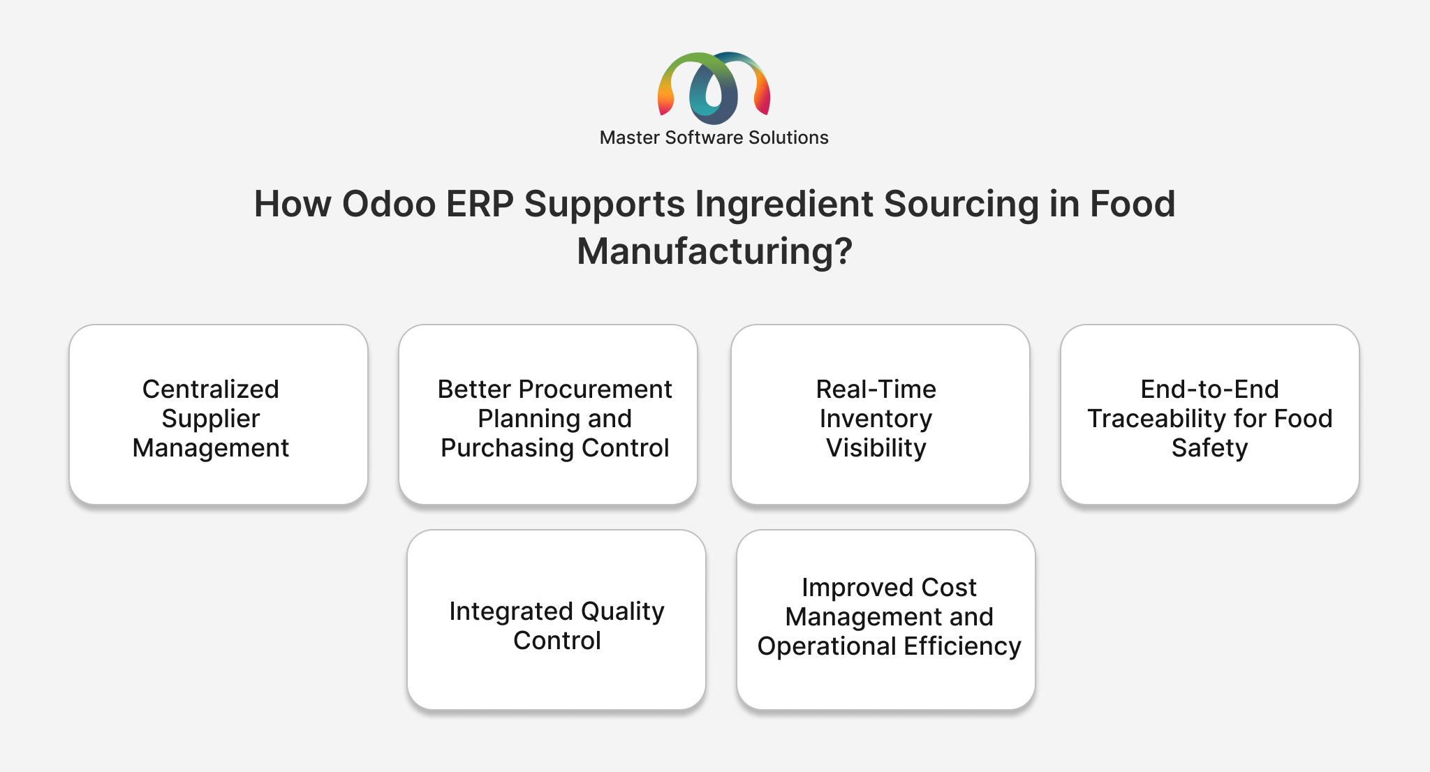 If your food manufacturing business is evaluating ERP solutions for stronger traceability and sourcing control, Master Software Solutions can help you plan and implement the right-fit system using Odoo based on your operational needs. Contact us Today