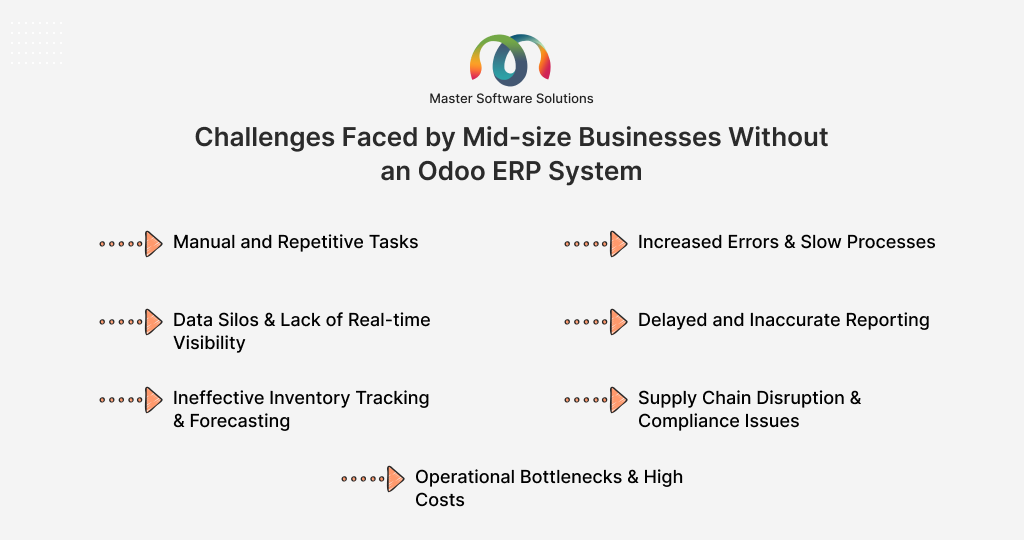 Medium-sized businesses that operate without an Odoo ERP often face challenges as they grow and scale. These challenges are mainly due to manual processes, disconnected software, and fragmented data. Here are the challenges faced by mid-size businesses without an Odoo ERP system: