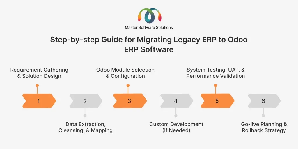 A structured, step-by-step migration process is essential to ensure a smooth transition from a legacy ERP system to Odoo. Each phase focuses on minimizing risk, maintaining business continuity, and ensuring the new system aligns with operational and strategic goals. Here is a step-by-step guide for migrating legacy ERP to Odoo ERP software.