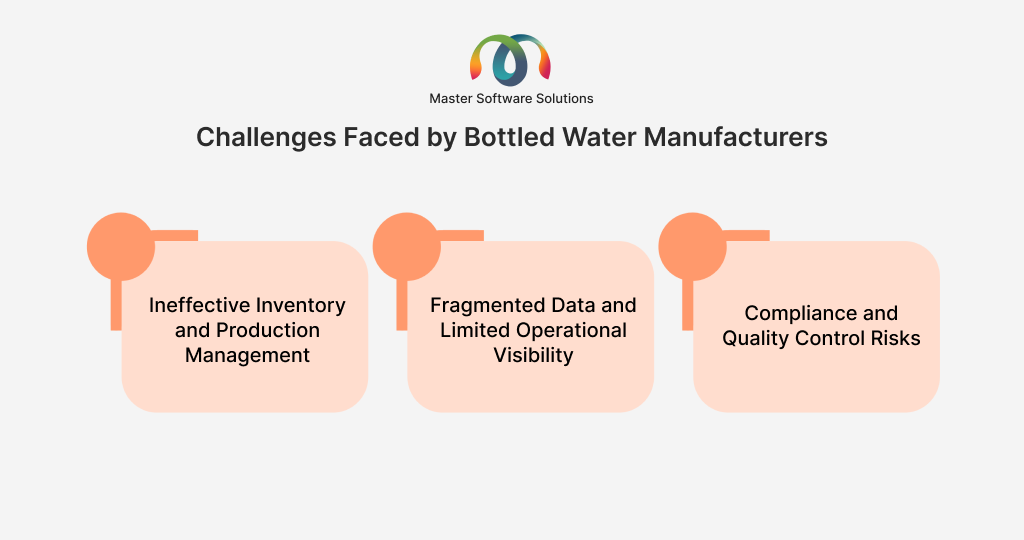 The bottled water businesses face various challenges without advanced tools, such as ERP solutions. Without an integrated system, organizations rely on manual management, which includes manual data entry, multiple isolated systems, and paperwork, increasing the chances of human errors and operational disruptions. Three major challenges faced by bottled water manufacturers are: