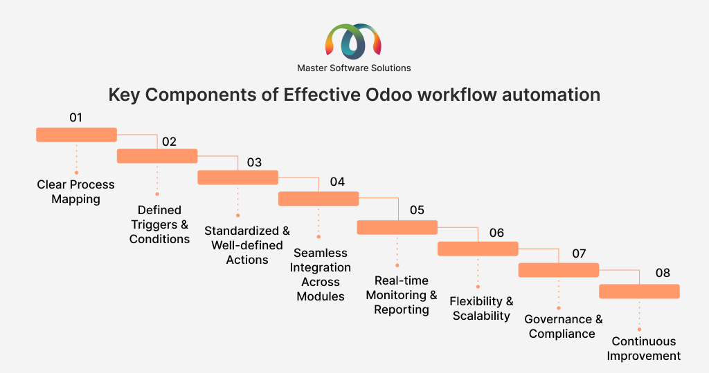 Implementing Workflow Automation in Odoo isnāt just about setting up triggers and actions; itās about designing a system that supports your business goals, scales with your growth, and enhances team productivity. Here are the components that form a solid foundation for an effective automation strategy:
