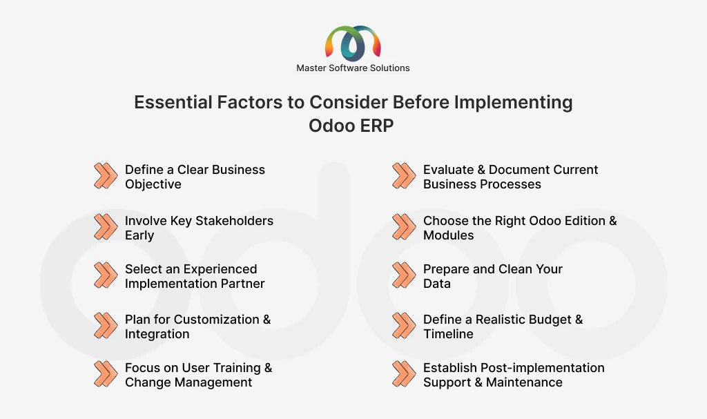 ravi garg, master software solutions, factors, odoo implementation, business objective, current business proceses, stakeholders, implementation partner, prepare and clean data, customization, integration, realistic budget and timeline, user training, change management, post-implement, support and maintenance